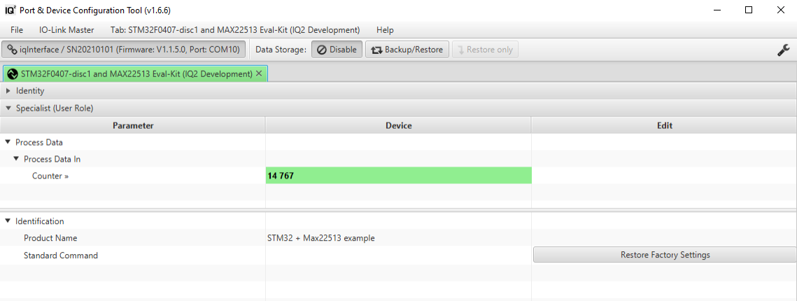 STM32 Discovery based on STM32 F4 MCU MAX22513 Evaluation Kit based on MAX22513 IO-Link Device chip The demo application shows the hardware and software implementation for IO-Link device.